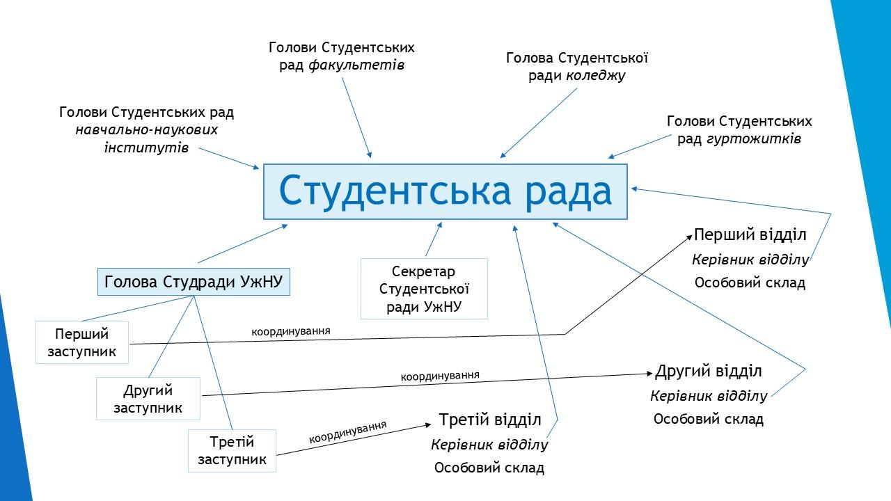 - Студентська рада структурного підрозділу – виконавчий орган, який функціонує на рівні кожного факультету/навчально-наукового інституту/ коледжу.