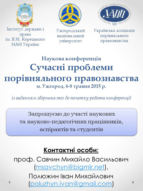 Під егідою Інституту держави і права ім. В.М. Корецького НАН України, Української асоціації порівняльного правознавства та Ужгородського національного університету протягом 6‑8 травня в Ужгороді відбудеться міжнародна наукова конференція «Сучасні проблеми порівняльного правознавства», які регулярно проводяться із 2006 року.