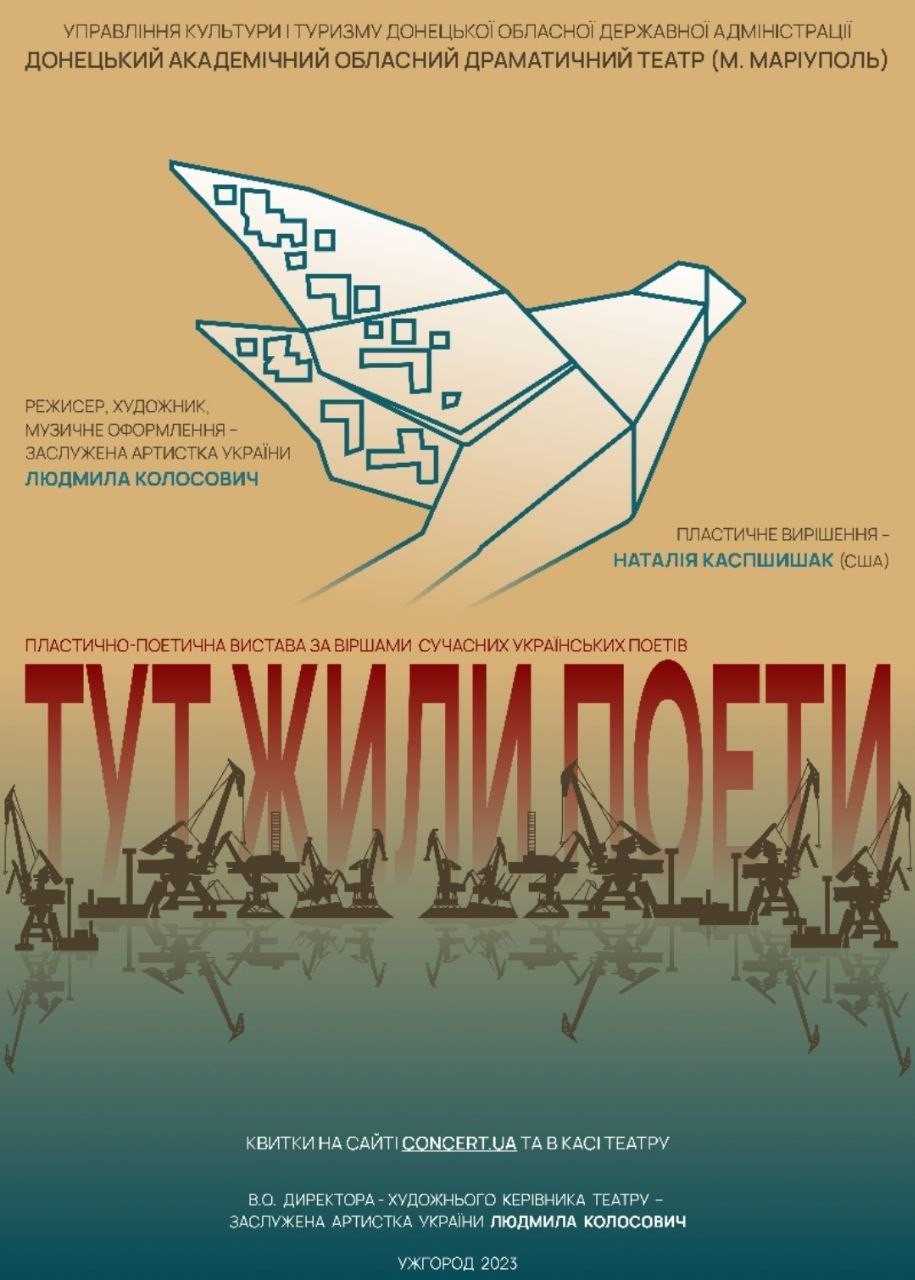 Дев'ята ПРЕМ'ЄРА Донецького академічного обласного драматичного театру (м. Маріуполь)! «Тут жили поети» — нова пластично-поетична вистава за віршами сучасних українських поетів: Макса Грабовського Макс Грабовський Максима Чумака Maksym Chumak Валерії Суботіної (Нави) Валерія Суботіна Альони Васильченко Алена Васильченко "Тут жили поети" - це поєднання віршів, музики та пластики тіла, яку дистанційно із США створила наша чудова режисерка з пластики - Наталія Каспшишак Запрошуємо разом з нами не просто відкрити нові імена українських поетів, а й побувати на довоєнній Донеччині, на Азовському морі, побачити "минуле" мирне життя та відчути зміни, які принесла в нього війна. Режисер, художник, музичне оформлення вистави - заслужена артистка України Людмила Колосович.