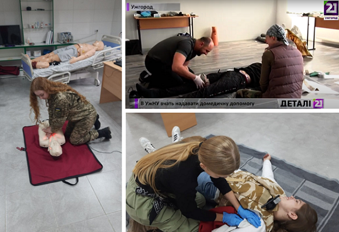 Термін "перший на місці події" означає перших осіб, що прибули на місце події як індивідуально, так і в складі груп до появи професійних медичних працівників. Перший на місці події - це людина, що виконує базові маніпуляції для порятунку життя постраждалого з використанням мінімального набору обладнання або за його повної відсутності. Тривалість програми 16 годин (два дні). Навчання та відпрацювання навичок проводяться із використанням сучасного манекен-торса дорослого для серцево-легеневої реанімації Brayden із світловою індикацією та бездротовим пристроєм зворотнього зв’язку, муляжів різних ран із симульованою кровотечею, а також манекеном для тампонування ран. Тренінг проводиться викладачами УжНУ – лікарями, які пройшли відповідне навчання міжнародному протоколу домедичної допомоги у Литовському університеті наук про здоров’я або навчання за програмою бойових медиків.