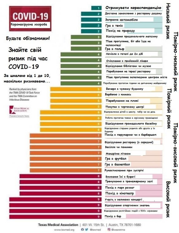 Якщо хочете зменшити ризик зараження коронавірусом і вірите епідеміологам - не відвідуйте бари, нічні клуби ,концерти та інші заходи з участю 500 та більше чоловік! Також дуже небезпечно їздити міськими маршрутами в транспортних засобах ,відвідувати закриті спортивні зали для тренувань або вживати сніданки у вигляді шведських столів або буфетів! Високо-середнім ступенем зараження відмічені участь у весіллях, днях народженнях чи похоронах, привітання у вигляді тиснення рук чи обіймів, відвідування будинків для старших людей чи інтернатів, гра в футбол та баскетбол, подорож літаком, відвідування перукарень та салонів краси. Самий низький ризик зараження показаний при вигулюванні собак, роботі на комп’ютері, грі в теніс, відкритті поштових скриньок, кемпуванні, заправки авто. Про низький, середній та високі ризики у вигляді таблиці декілька тижнів назад повідомила Техаська Медична Асоціація, а тепер у Чехіі майже ідентичні дані опублікувала CHYTRA KARANTENA, причому шкала починається від відносного ризику (1) до високого (9). До середнього ризику віднесено навчання дітей в школах, плавання в громадських басейнах, командні види спорту, шопінг, відвідування відносно старших людей та друзів на дому.