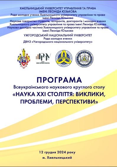Запрошуємо Вас взяти участь у Науковому круглому столі на тему «Наука ХХІ століття: виклики, проблеми, перспективи», який відбудеться в Хмельницькому університеті управління та права імені Леоніда Юзькова 12 грудня 2024 року о 10:00. Науковий захід буде проходити у змішаному форматі: