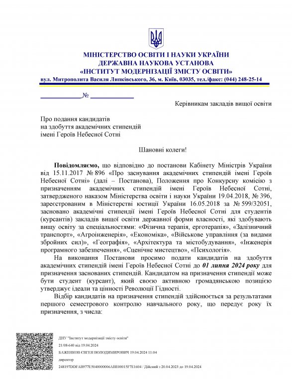Повідомляємо, що відповідно до постанови Кабінету Міністрів України від 15.11.2017 No 896 «Про заснування академічних стипендій імені Героїв Небесної Сотні» (далі – Постанова), Положення про Конкурсну комісію з призначенням академічних стипендій імені Героїв Небесної Сотні, затвердженого наказом Міністерства освіти і науки України 19.04.2018, No 396, зареєстрованим в Міністерстві юстиції України 16.05.2018 за No 599/32051, засновано академічні стипендії імені Героїв Небесної Сотні для студентів (курсантів) закладів вищої освіти державної форми власності, які здобувають вищу освіту за спеціальностями: «Фізична терапія, ерготерапія», «Залізничний транспорт», «Агроінженерія», «Економіка», «Військове управління (за видами збройних сил)», «Географія», «Архітектура та містобудування», «Інженерія програмного забезпечення», «Сценічне мистецтво», «Психологія».