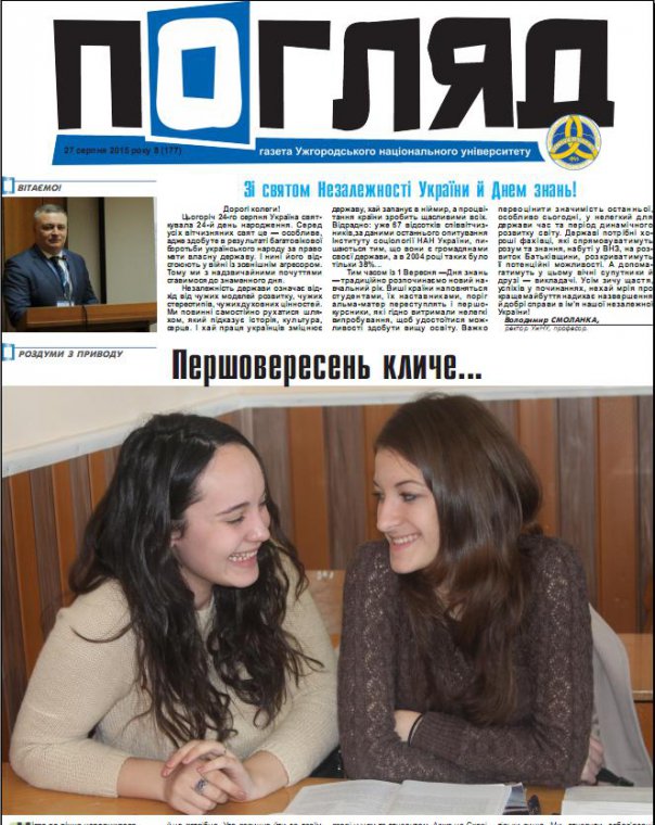 До уваги читачів – серпневий випуск «Погляду» (№8 (177). Газета підводить до одного з головних свят викладачів і студентів – Дня знань, а також присвячена актуальним темам: зі сторінки 2-ї дізнавайтеся про результати вступної кампанії-2015; на 3-й – читайте роздуми з приводу 24-ї річниці незалежності України. До 70-ліття нашого ВНЗ у цьому номері підготовлено дві публікації: «Наставники згадують…» (С.4) та «Перша команда УжДУ» (С.7). Наприкінці кожного літа актуальним залишається питання поселення в гуртожитки, про що й розповів «Погляду» директор студмістечка Василь Кепич в інтерв’ю «Початок змінам покладено…»