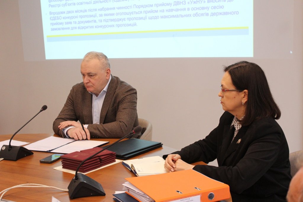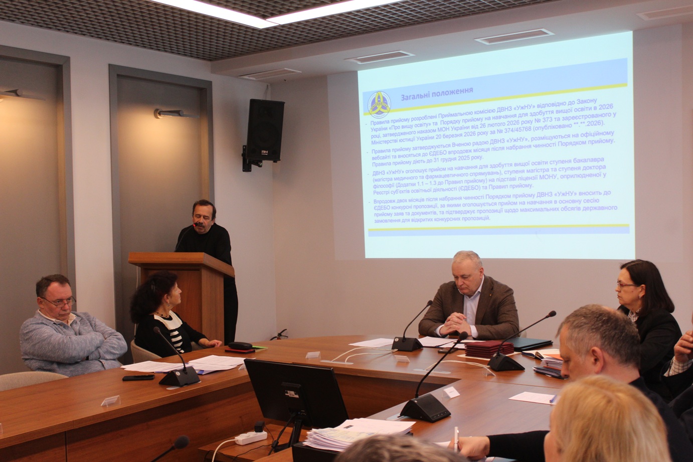 Щодо правил прийому на навчання для здобуття вищої освіти в УжНУ у 2026 році, за словами відповідального секретаря приймальної комісії Петра Горвата, потреба в їх розгляді виникла через те, що кілька днів тому Порядок прийому пройшов верифікацію в Міністерстві юстиції. Університет зацікавлений у якнайшвидшому затвердженні правил, адже це дасть змогу розпочати прийом іноземних студентів уже у квітні.