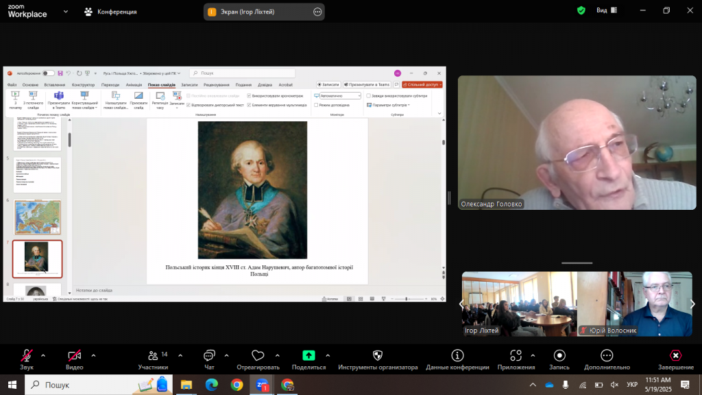 19 травня 2025 року історики-другокурсники Ужгородського національного університету, які навчаються за ОПП першого (бакалаврського) рівня вищої освіти за спеціальністю 014 Середня освіта, прослухали гостьову лекцію знаного українського медієвіста, доктора історичних наук, старшого наукового співробітника Інституту української археографії та джерелознавства ім. М.С.Грушевського, академіка АН Вищої школи України Олександра Головка. Тема лекції – «Русь і Польща в міжнародному житті Європи (Х – перша половина ХІІІ ст.».