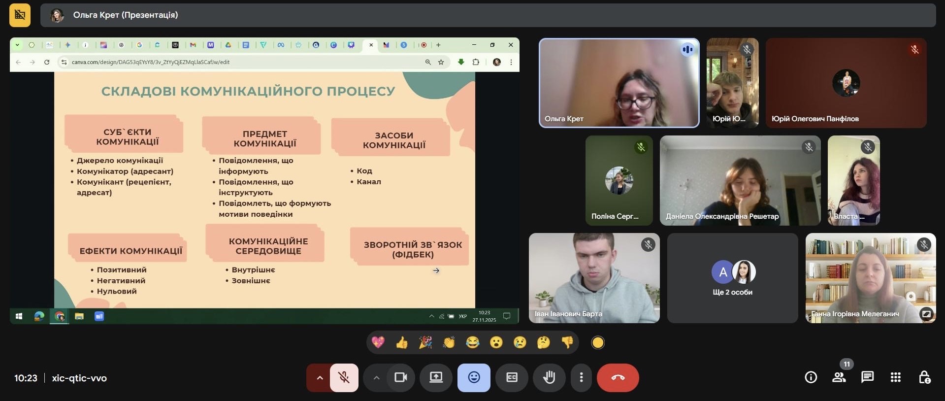 27 листопада студенти другого курсу спеціальності «Міжнародні відносини, суспільні комунікації та регіональні студії» факультету історії та міжнародних відносин ДВНЗ «УжНУ» у рамках курсу «Історія та теорія міжнародних суспільних комунікацій» взяли участь у динамічній та професійно орієнтованій гостьовій лекції, яку провела Ольга Крет — кандидатка політичних наук і доцентка кафедри політології та міжнародних відносин Рівненського державного гуманітарного університету. Онлайн-зустріч, присвячена темі «Мистецтво ефективної комунікації. Подолання комунікаційних бар’єрів», стала для студентів не просто черговим навчальним заходом, а цілісним досвідом, що поєднав теоретичні знання з практичними навичками та особистими відкриттями. З перших хвилин лекції спікерка наголосила на тому, що комунікація — це не технічний інструмент чи набір правил, а фундаментальна складова життя суспільства, без якої неможливо уявити взаємодію між людьми, функціонування соціальних інститутів та розвиток міжнародних відносин. Саме завдяки ефективному спілкуванню формується довіра, будується партнерство, вирішуються конфлікти та приймаються рішення на локальному й глобальному рівнях.