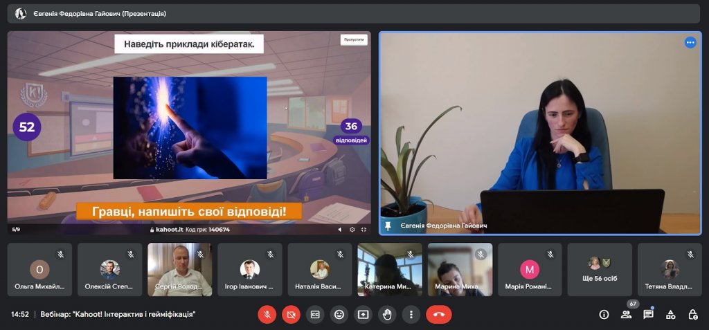 Євгенія Федорівна висвітлила ці та інші гейміфіковані можливості навчання, включаючи налаштування персонажів, нікнейми та теми, наголосила на різниці в інтерфейсах для ведучого гри та користувача.