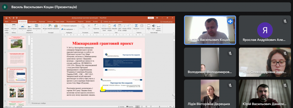Лектор охарактеризував більше ніж десятирічний досвід музею з отримання грантової підтримки та успішної реалізації різноманітних проєктів. У 2013 р. музей взяв участь у грантовому проєкті «Проривна культура – європейські цінності та спільне майбутнє. HUSKROUA 1101/139» у ролі партнера Повітового музею Сату Маре (Румунія). Проєкт був запроваджений у ході реалізації Програми прикордонного співробітництва Угорщина-Словаччина-Румунія-Україна ENPI – CBC – 2007-2013. 1 жовтня 2019 р. Закарпатський музей народної архітектури та побуту разом з Повітовим музеєм Сату Маре (Румунія) та Музеєм української культури у Свиднику (Словаччина) починає реалізовувати європейський проєкт: «Культурні зв’язки – культурна мобільність у прикордонній зоні. HUSKROUA / 1702 / 3.1 / 0040», який фінансується за допомогою програми ENC CBC «Угорщина-Словаччина-Румунія-Україна 2014-2020». За рахунок фінансування гранту музей зміг зміцнити матеріально-технічну базу. Було закуплено сучасне фондове обладнання, комп'ютерну техніку, автомобіль, видано чимало літератури.