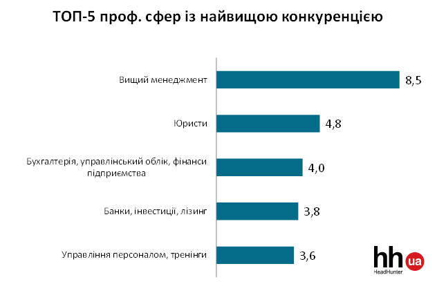Як і місяць тому, до трійки лідерів проф. сфер із найвищою конкуренцією увійшли ТОП-менеджери, юристи і бухгалтери. Крім того, в рейтингу з’явилися співробітники банків, а також спеціалісти з управління персоналом.