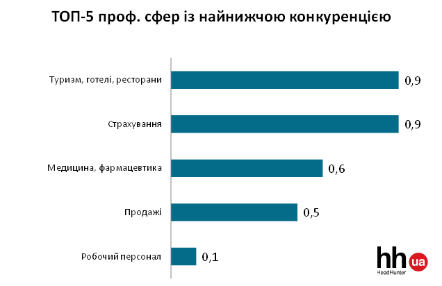 Незначні зміни відбулися в ТОП-5 проф. сфер із найнижчою конкуренцією. Як і раніше, добре затребувані на ринку праці співробітники страхових компаній, спеціалісти з продажу й представники робочих спеціальностей. Повернулися до рейтингу медики і фармацевти. Також у листопаді не було проблем із пошуком роботи в спеціалістів з готельного та туристичного бізнесу.