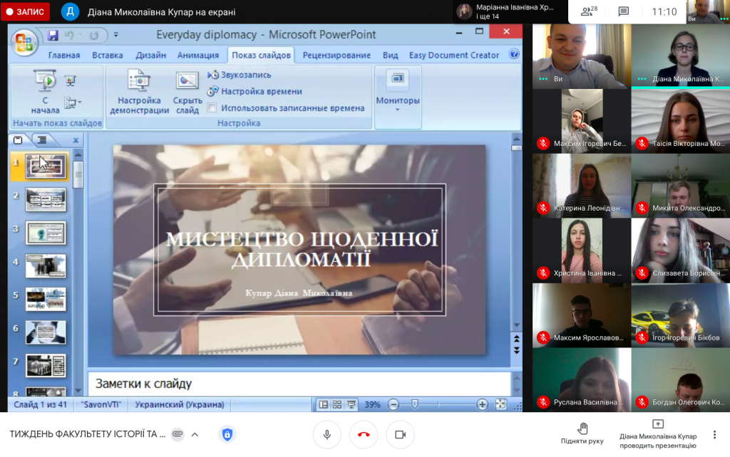 Саме золотим правилам щоденної дипломатії був присвячений треніг для студентів-міжнародників, який відбувся 6 травня у рамках святкування Тижня Факультету історії та міжнародних відносин. Захід провела старший викладач кафедри міжнародних студій та суспільних комунікацій Діана Купар.
