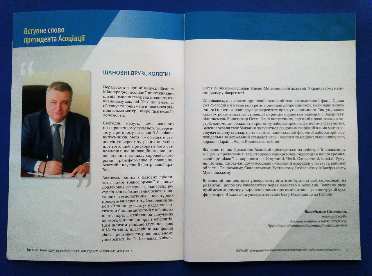 На перших сторінках «Вісника» читачів вітає ректор УжНУ, президент асоціації Володимир Смоланка. Після його вступного слова у рубриці «З історії альма-матер» розміщена коротка інформація про УжНУ, а також світлини всіх ректорів вишу за 72 роки його існування. На початку видання автори пояснюють мету і цілі Міжнародної асоціації випускників, відтак оприлюднюють імена членів ради, правління асоціації, ревізійної комісії. Докладніше зі структурою ГО «Міжнародна асоціація випускників» й обов’язками її членів можна ознайомитися на сторінці 15.