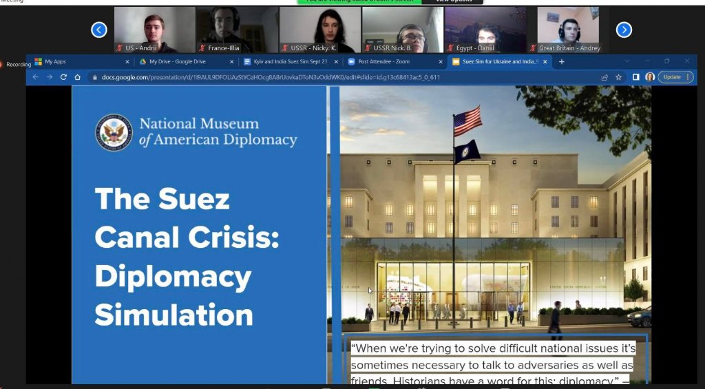 Оксана Курей – доцент кафедри бізнесу-адміністрування, маркетингу та менеджменту, заступник декана із міжнародної співпраці Олеся Бенчак та студенти 3-го курсу спеціальності 291 «МВСКРС» – Ілля Тягур, Катерина Ляшенко, Андрій Міхеєв на запрошення Київської школи дипломатичних мистецтв та в рамках їхнього проєкту Countering Fake Histories in International Politics and Propaganda, що організований Національним музеєм американської дипломатії (National Museum of American Diplomacy) – одним із підрозділів Державного Департаменту США взяли участь у міжнародній симуляційній грі присвяченій темі «Суецька криза».