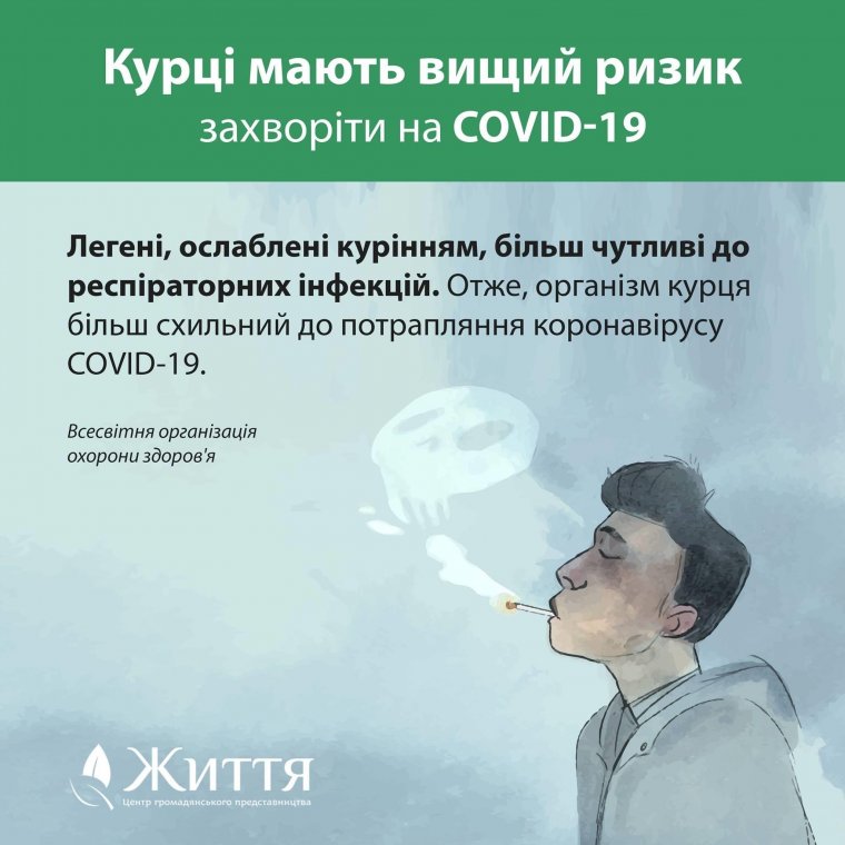 - Ускладення інфекцій дихальних шляхів. Куріння знижує імунну відповідь легень, полегшує проникнення збудників у дихальні шляхи та посилює пошкоджуючий вплив. В період пандемії COVID-19 це особливо актуально, оскільки курці мають більший ризик підхопити вірус та мають важчий перебіг захворювання.