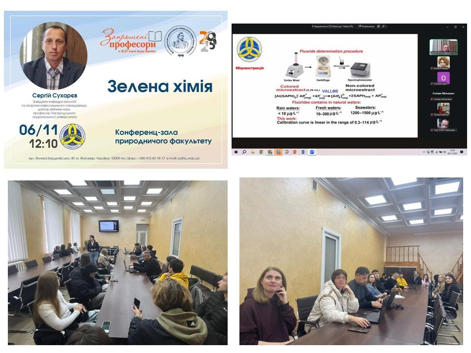 У четвер 06.11.2025 року в онлайн форматі (слухачі і офлайн форматі) завідувач кафедри екології та охорони навколишнього середовища Навчально-наукового інституту хімії та екології Сергій Сухарев прочитав публічну лекцію для здобувачів вищої освіти (спеціальності 101 (Е 2) екологія)та викладачів кафедри екології та географії Житомирського державного університету імені Івана Франка на тему «Зелена хімія». Було представлено історію становлення та принципи Зеленої хімії, практичне застосування цих принципів при виробництві хімічних сполук, в агросфері, для одержання альтернативних палив, тощо. Акцентовано, що Зелена хімія – це нова філософія, яка потребує практичної реалізації у всіх сферах діяльності, особливо задля збереження навколишнього природного середовища. Представлено приклади застосування принципів Зеленої хімії для одержання наночастинок деяких металів, які можуть мати потенційне застосування в медицині, що є провідною науковою тематикою кафедри екології Пряшівського університету. Наведено власні приклади впровадження мікроекстраекційних (та безекстракційних) методик моніторингу об’єктів довкілля, що є науковою тематикою кафедри екології та охорони навколишнього середовища ДВНЗ «УжНУ». До лекції також залучилися викладачі, аспіранти та студенти кафедри ЕОНС.