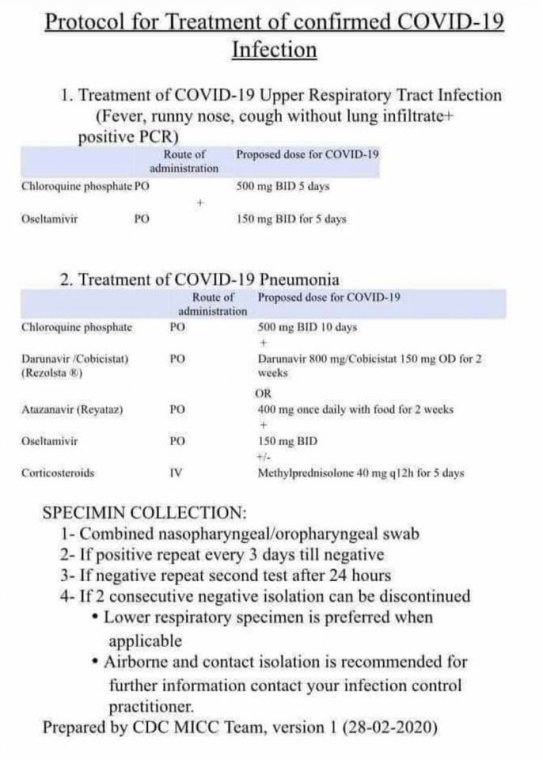 Нехай залишається під руками. Звертає на себе увагу використання в протоколі протималярійного, протипротозойного, імунодепресанта і, навіть, колись антиревматичного делагілу (chloroquinum, хлорохін)та інгібіторів нейрорамінідази озельтамівіру (та інших противірусних) більш відомого у нас під назвою ТАМІФЛЮ! Дуже важливо, що ці два препарати ще недавно були в достатній кількості в УКРАІНІ!
