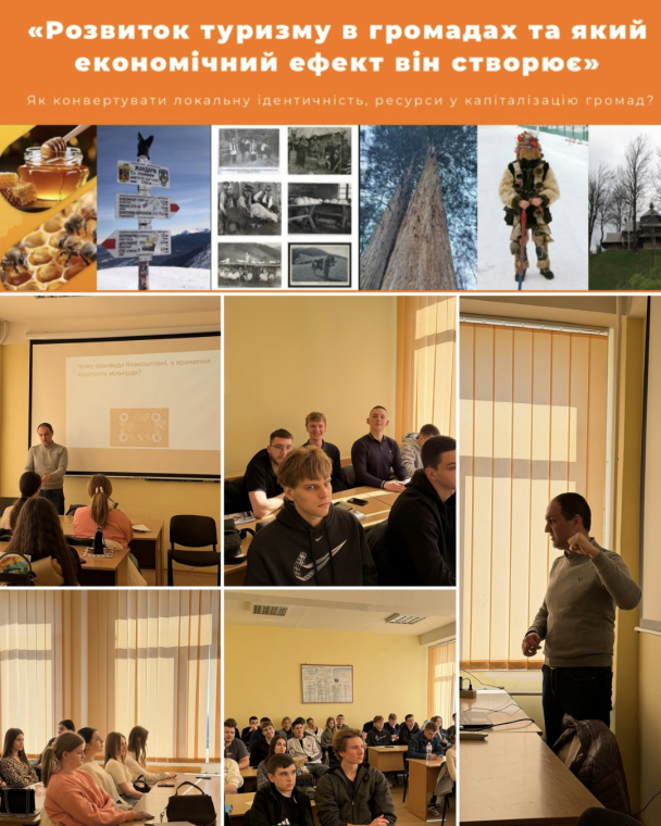 Для студентів другого курсу бакалаврату економічного факультету спеціальностей C1 «Економіка та міжнародні економічні відносини», D3 «Менеджмент» та D7 «Торгівля» було проведено змістовну лекцію на тему розвитку туризму в територіальних громадах та його економічного впливу. Захід був спрямований на розширення професійного кругозору студентів і ознайомлення з сучасними підходами до використання туристичного потенціалу регіонів.