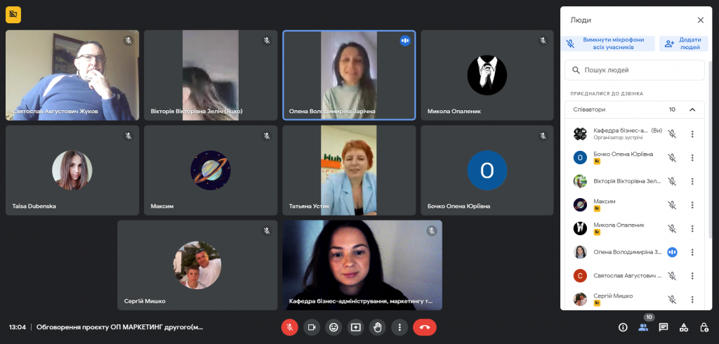 Гарант освітньої програми, професор Зарічна О.В., відзначила актуальність перегляду унікальності та структурних частин програми, підкреслила важливість уточнення фахових компетенцій та результатів навчання. Також визначено основний склад робочої групи для подальшого вдосконалення програми, до якого ввійшли: професори Зарічна О.В. (гарант) та Жуков С.А., доценти Дюгованець О.М., Курей О.А. та Зеліч В.В..