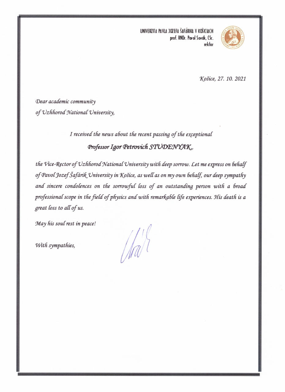 У зв'язку зі смерттю професора Ігоря Петровича Студеняка до ректорату УжНУ надійшли співчуття від Закарпатської обласної та Ужгородської міської рад і від колег, які тривалий час плідно співпрацювали і підтримували теплі та дружні стосунки.