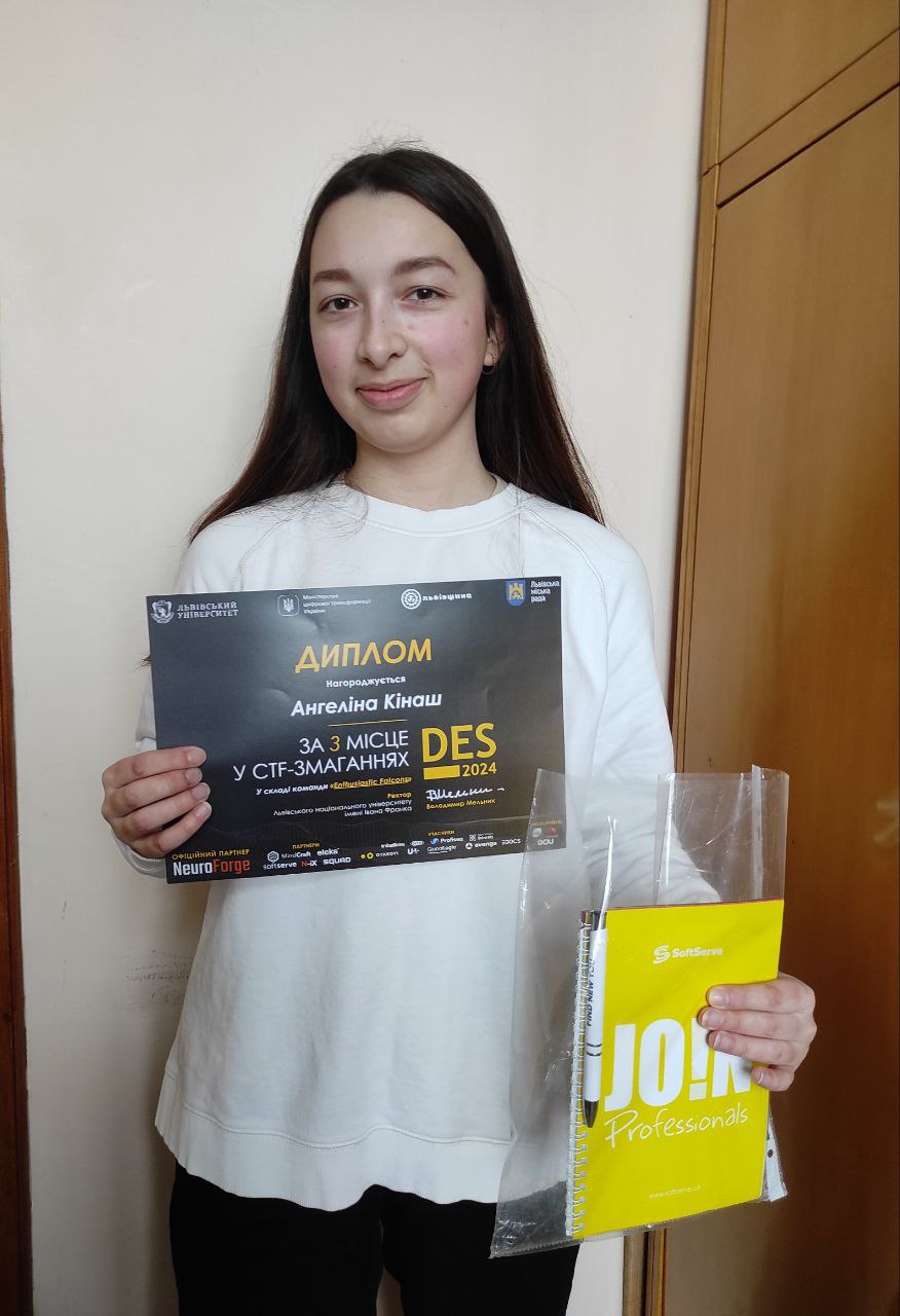 Ангеліна Кінаш, студентка 2-го курсу кафедри ТЕІБ: «Я дуже рада, що прийняла участь у змаганнях CTF. Даний конкурс дав дуже хорошу можливість перевірити свої знання, а також познайомитись з новими людьми. Завдання були різними і дуже цікавими, вони поділені на різні рівні важкості. Мені поталанило з командою, тому що ми всі доклали багато зусиль, щоб отримати перемогу. Наша команда продемонструвала неймовірний дух боротьби та рішучість. Суперники також продемонстрували високий рівень підготовки. Ця перемога - заслуга кожного учасника моєї команди!»