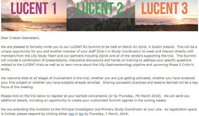 21-22 березня 2019 року завідувач кафедри терапії та сімейної медицини к.мед.н., доц. Чубірко К.І. та асистент кафедри Дебрецені К.О. здійснили робочу поїздку в м. Дублін (Ірландія). Метою подорожі була участь у конференції-тренінгу, на якій розглядалися питання сучасного лікування та ведення пацієнтів з неспецифічним виразковим колітом та ознайомлення з протоколом міжнародного рандомізованого клінічного дослідження I6T-MC-AMAN*, яке буде виконуватись в нашому дослідницькому центрі. На зустрічі керівників та виконавців проекту були отримані нові знання про один із новітніх препаратів для лікування неспецифічного виразкового коліту та тактику та особливості ведення пацієнтів в рамках даного клінічного дослідження. Участь у цій програмі дозволить пацієнтам Закарпатської області отримати якісну діагностику та лікування цього захворювання у відповідності до найкращої світової практики. Медичний контроль за станом хворих буде здійснюватись працівниками дослідницького центру у співробітництві з Eli Lilly and Company.