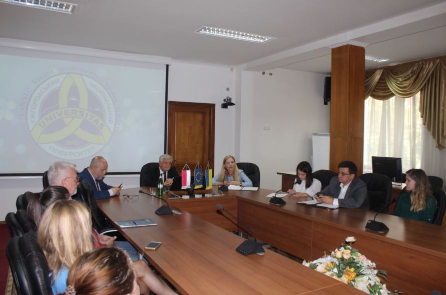 Мирослава Лендьел ознайомила поважних гостей щодо існуючої співпраці між польськими університетами та УжНУ: «Ми намагаємося розвивати співпрацю з Польщею, зокрема у сфері подвійних дипломів. З Поморською Академією в Слупську ми вже 4 роки плідно працюємо в цьому напрямку. Щороку 20-30 наших студентів навчаються там. Нещодавно ми започаткували співпрацю з Академією Ігнаціум у Кракові. Загалом ми маємо більше10 міжнародних партнерських вишів саме з Польщі».