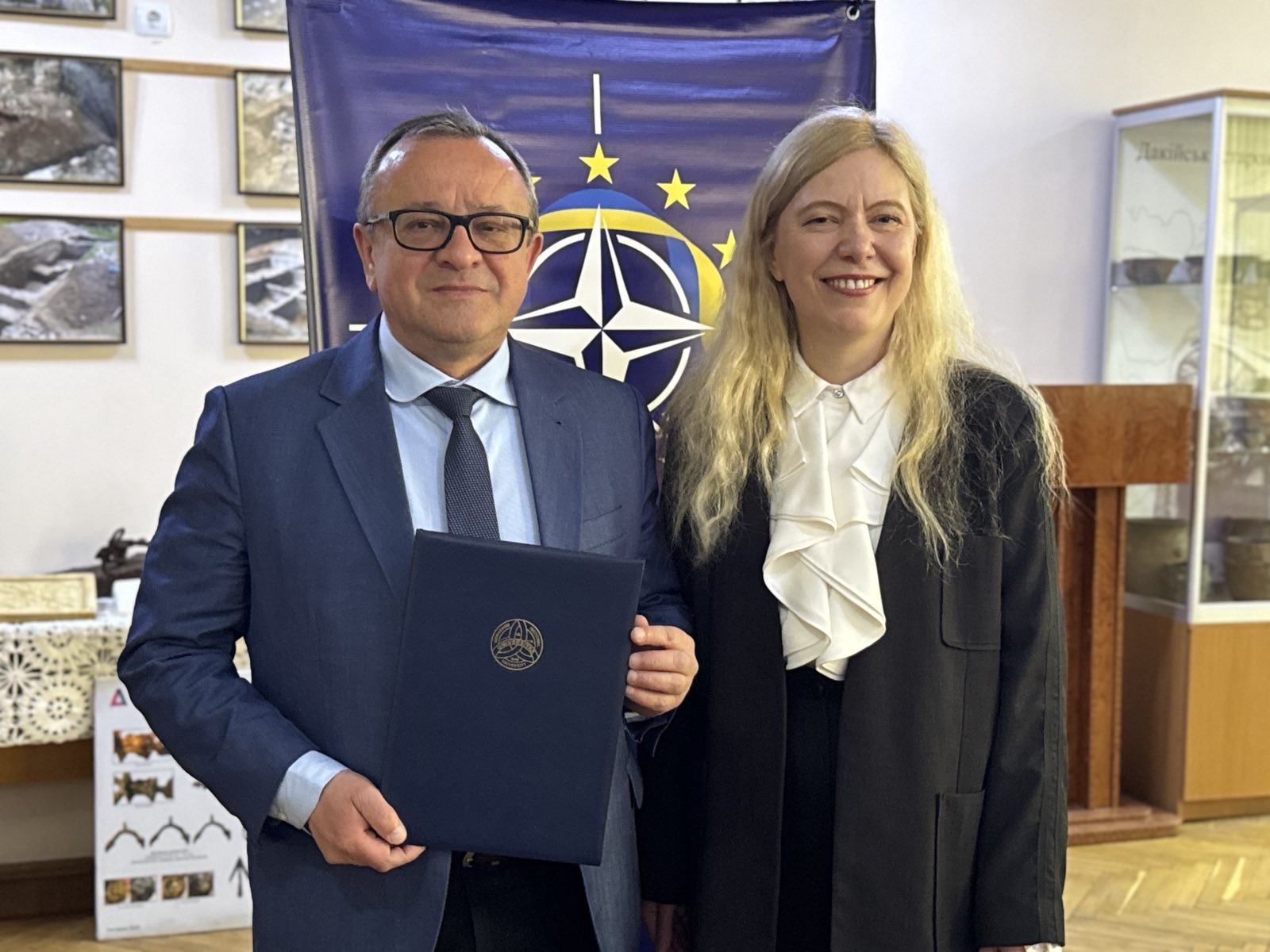 На початку зустрічі проректорка УжНУ, докторка політичних наук Мирослава Лендьел, за дорученням ректора Володимира Смоланки, вручила гостеві ухвалу Вченої ради УжНУ про удостоєння Александра Дулеби академічної відзнаки Honoris Causa.
