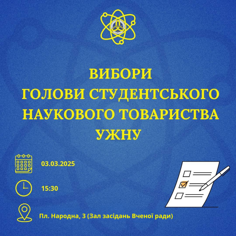 3-го березня 2025 року о 15:30 в залі засідань Вченої ради (м. Ужгород, пл. Народна, 3) відбудуться вибори голови Студентського наукового товариства УжНУ в межах Загальних Зборів СНТ УжНУ через голосування обраних делегатів від кожного із Студентських наукових товариств факультетів УжНУ.