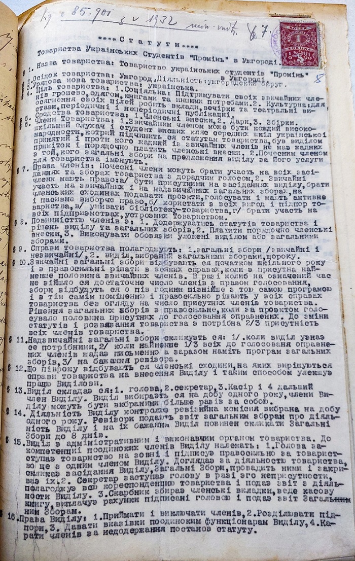 Статут Товариства українських студентів «Промінь» в Ужгороді, 1933 рік