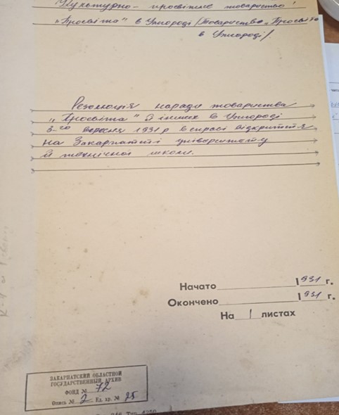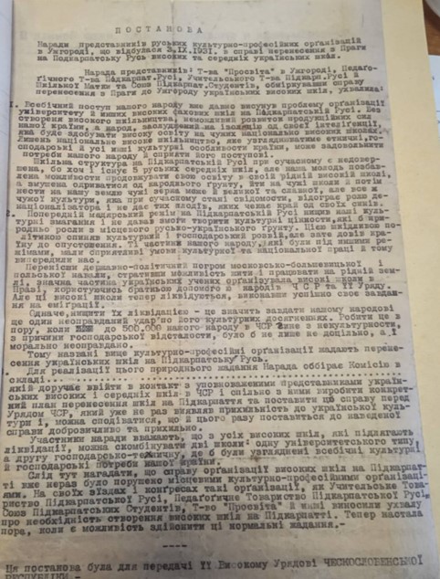Постанова Наради представників руських культурно-професійних організацій в Ужгороді в справі перенесення з Праги на Підкарпатську Русь високих та середніх українських шкіл, 3.09.1931 року