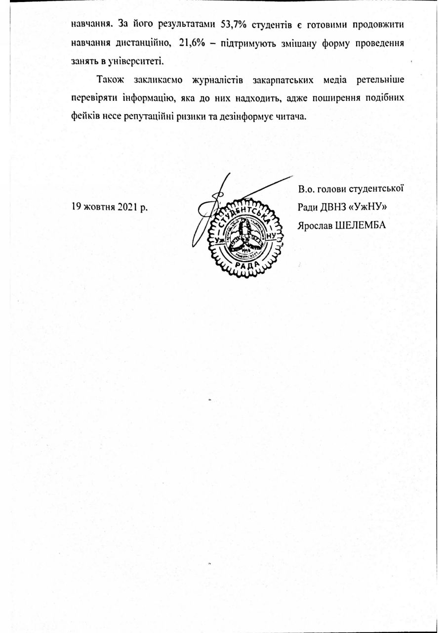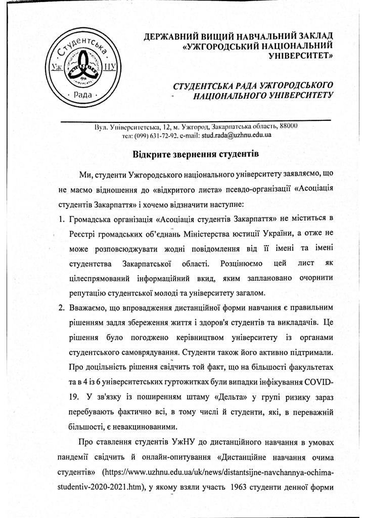 1. Громадська організація “Асоціація студентів Закарпаття” не міститься в Реєстрі громадських об'єднань Міністерства юстиції України, а отже не може розповсюджувати жодні повідомлення від її імені та імені студентства Закарпатської області. Розцінюємо цей лист як цілеспрямований інформаційний вкид, яким заплановано очорнити репутацію студентської молоді та університету загалом.