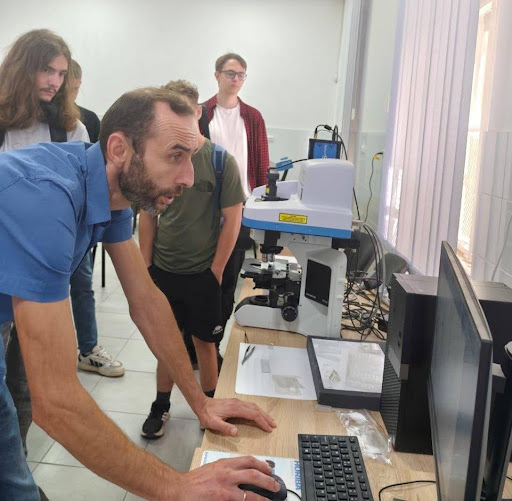 Доцент кафедри прикладної фізики і квантової електроніки Михайло Поп продемонстрував студентам роботу еліпсометра Smart SE – багатофункціональний спектральний еліпсометр для швидкого і точного аналізу тонких плівок; двопроменевого спектрофотометра Shimadzu UV-2600 та спектрометра комбінаційного розсіювання (раманівський) XploRA PLUS, а також розповів в яких саме галузях застосовуються матеріали, зокрема, халькогенідні плівки та нанокристали, які досліджують у ЦККНО.