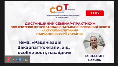Цими вихідними для вчителів для вчителів історії закладів загальної середньої освіти відбувся дистанційний семінар-практикум на тему: «Актуальні питання навчання історії України». Його організаторами і організаторами виступили міжнародний культурно-мистецький освітній проект «С.О.Т.» (Спілкування. Освіта. Творчість.), Громадська організація ТК «Модус-Ніка» м. Київ та суб’єкт підприємницької діяльності, що має право проводити освітню діяльність (Код КВЄД 85.59). Слухачами семінару стали вчителі ЗЗСО, які три дні – 21-23 червня 2024 р. відвідували лекції в онлайн форматі в інтерактивній формі. Крім того учасники семінару отримали повний відеозапис занять, а також відповідний сертифікат, який відповідає вимогам атестації працівників освіти та культури. Навчальний час семінару становив 21 академічну годину (0.7 кредиту ЄКТС).