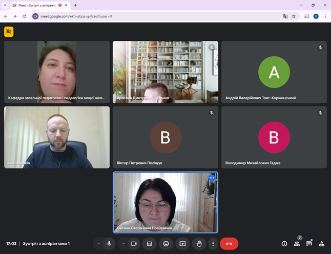 Сьогодні відбулася зустріч завідувачки кафедри загальної педагогіки та педагогіки вищої школи, професорки Оксани Повідайчик з аспірантами першого року навчання зі спеціальності 011 Освітні, педагогічні науки.