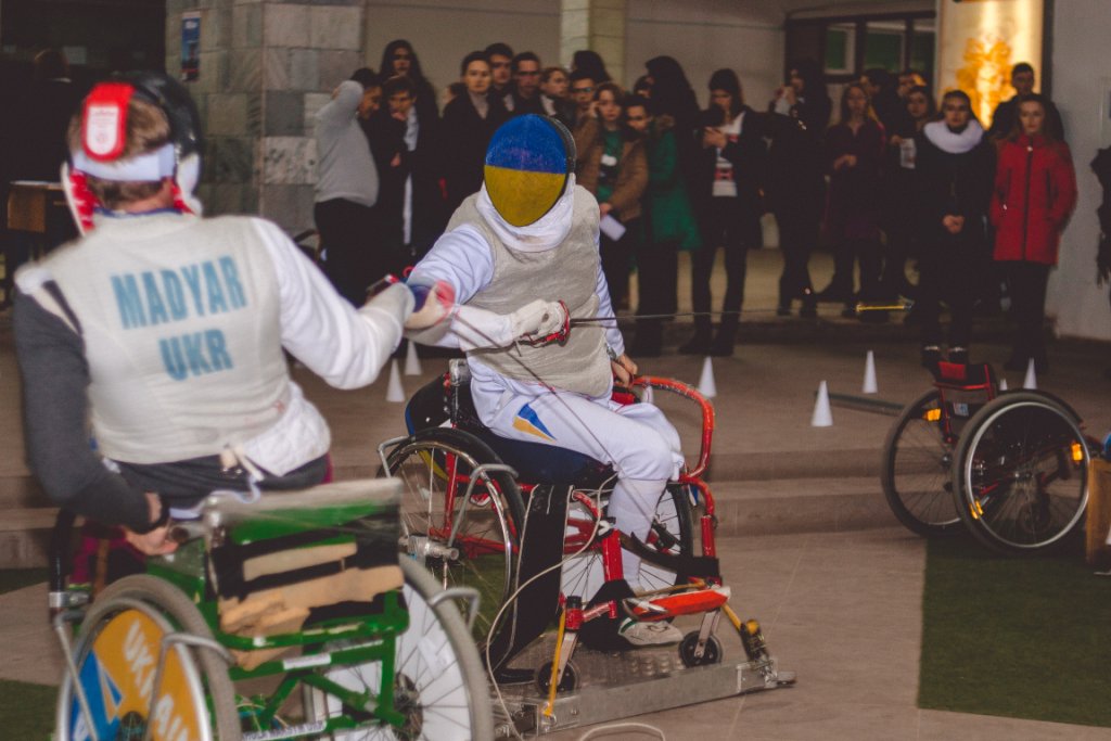 After the official ceremony, students had a unique chance to see a master class in fencing and overcoming barriers in wheelchairs. A master of sports of international class in wheelchair fencing, a member of Ukrainian national team Maksym Mahula, a gold medalist of the national fencing championship Nadiya Dyoloh, a new member of the team of fencers in Invasport Vadym Shutko and their coach Emilia Malyar-Fazykash arranged remarkable fencing performances for the spectators. Everybody had a chance to try on fencing outfits, hold weapons and even try fencing.