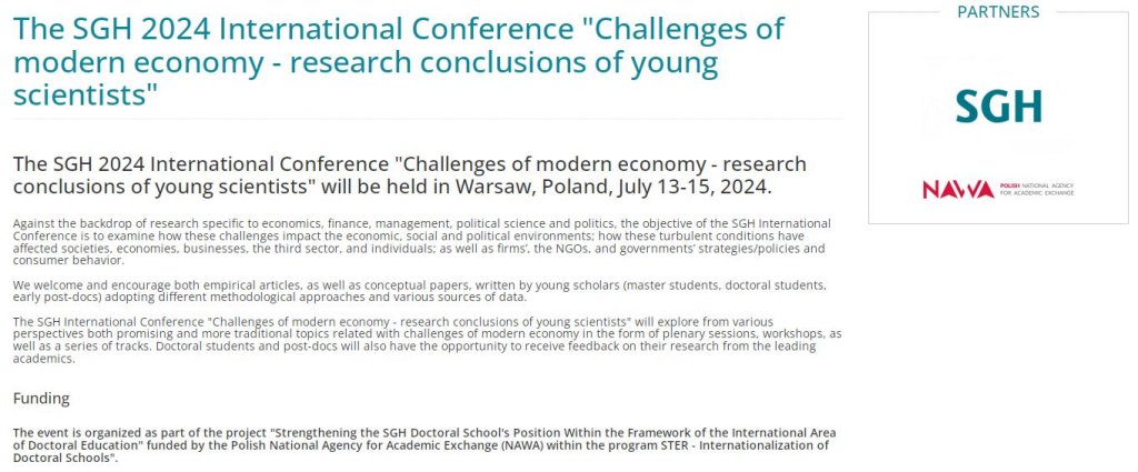 Thanks to the funding from the Polish National Agency for Academic Exchange’s (NAWA) project STER, participation in the SGH 2024 International Conference "Challenges of modern economy - research conclusions of young scientists" is free of charge.
