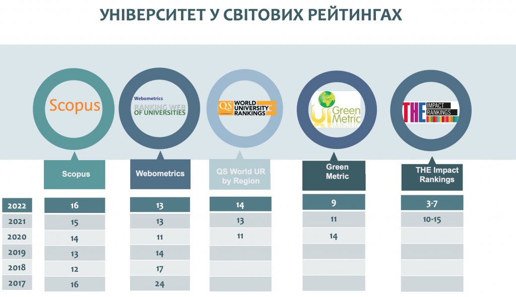 One of the most important success criteria for modern universities is their inclusion and positioning in international rankings. Uzhhorod National University significantly improved its position in the University Impact Rankings and entered top 1000 universities world-wide and was ranked #801-1000 with 50.9 points. For comparison, in 2021 the university was ranked #1001th+ with 36.4 points in the same ranking. Thus, in 2022, UzhNU occupied a leading #3-7 position among 26 Ukrainian higher education institutions.