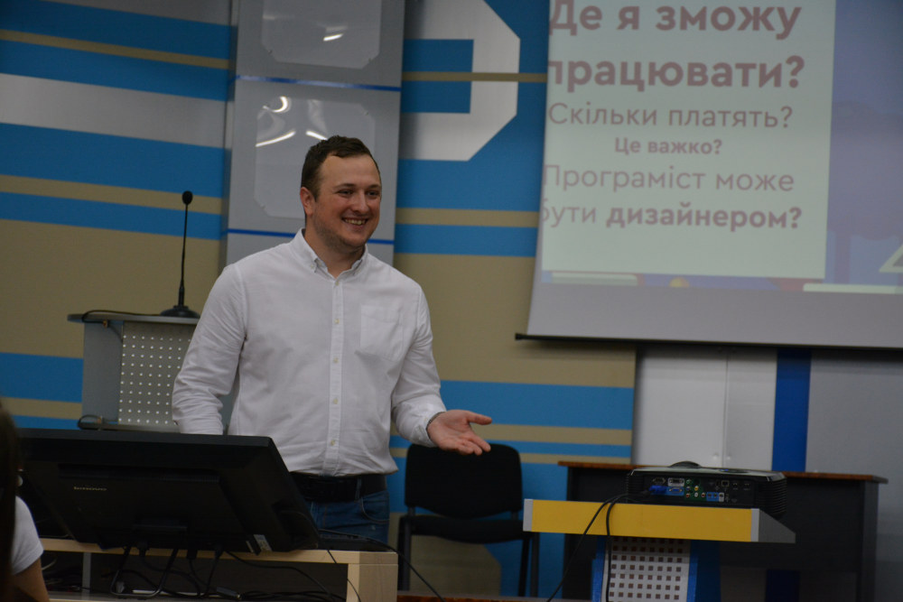 Насамперед учні завітали на факультет інформаційних технологій, де на них очікував заступник декана з виховної роботи Ігор Лях. Розповів Ігор Михайлович про цікавинки факультету, звернув увагу на спеціальності та запросив до слова доцента кафедри інформатики та фізико-математичних дисциплін Михайла Кляпа. «У середовищі дизайну, де за статистикою кожного дня реєструється 21500 нових доменних назв, тобто 21500 нових веб-сайтів. Звичайно, їхній період існування буває різноманітним: від кількох днів до десятків років», – зауважив Михайло Михайлович. Опісля детального розбору важливих аспектів веб-дизайну, викладач відповідав на питання. Аби додати родзинки зустрічі, показав створення в реальному часі векторного зображення, що особливо зацікавило учнів.