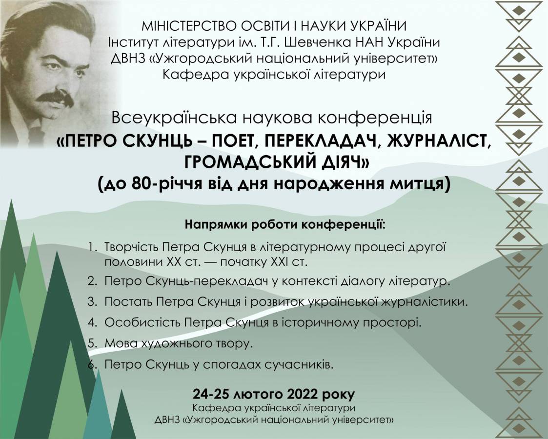 24-25 лютого на базі кафедри української літератури ДВНЗ «Ужгородський національний університет» у співпраці з Інститутом літератури імені Т. Г. Шевченка відбудеться Всеукраїнська наукова конференція «Петро Скунць – поет, перекладач, журналіст, громадський діяч» (до 80-річчя від дня народження митця).