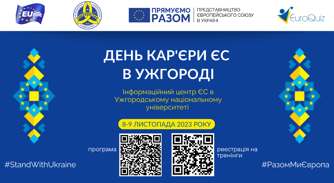 Представництво Європейського Союзу в Україні запрошує студентську молодь, представників громадських організацій, бізнесу, державних службовців та активних молодих громадян взяти участь в заході «День кар’єри ЄС», що відбудеться 08-09 листопада 2023 року за адресою: м. Ужгород, пл. Народна,3 (Зал Вченої ради УжНУ). Співорганізаторами події є Ужгородський національний університет, Інформаційний центр Європейського Союзу в м.Ужгород.