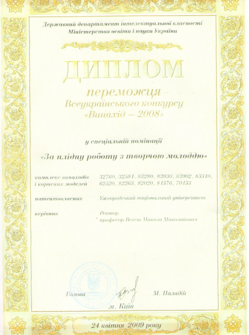 заявник і патентовласник Державний вищий навчальний заклад «Ужгородський наці-ональний університет». – № а 2018 10577; заявл. 26.10.2018; опубл. 10.04.2020, Бюл. № 7. |
