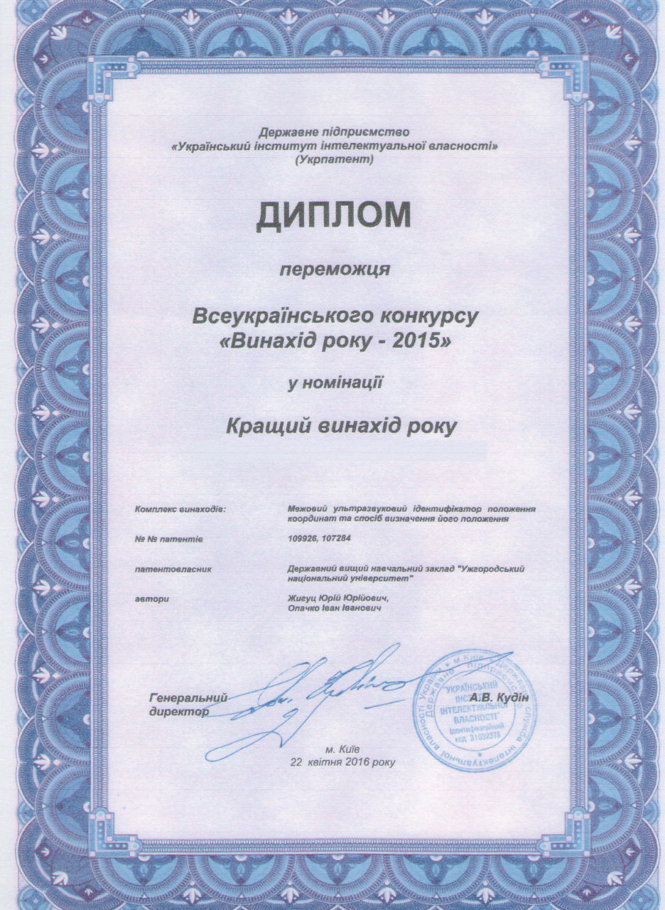 В 2015 році зав. кафедри проф. Ю.Ю.Жигуц у співавторстві з проф. І.І.Опачко стали переможцями Всеукраїнського конкурсу «Винахід року – 2015» за комплекс винаходів «Межовий ультразвуковий ідентифікатор положення координат та спосіб визначення його положення» (пат. №109926 та 107284).