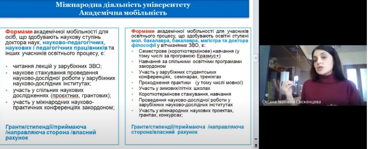 Оксана Свєженцева ознайомила із основними різновидами академічної мобільності. Варто зазначити, що пандемія внесла серйозні корективи у методи ведення академічної мобільності у 2020-2021 роках, але вона може відбуватися й у дистанційному форматі.