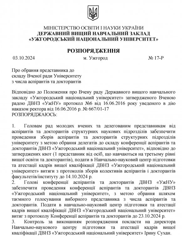 Новина в рамках виконання Розпорядження ДВНЗ "УжНУ" від 03.10.2024 № 17-Р "Про обрання представника до складу Вченої ради Університету з числа аспірантів та докторантів"