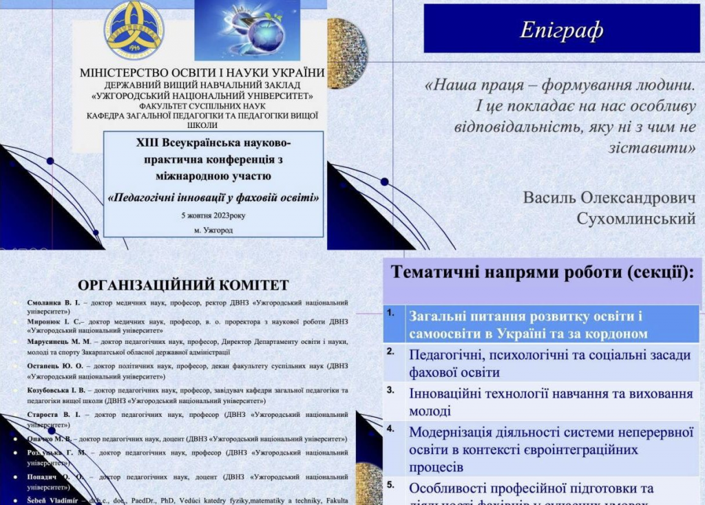 5 жовтня 2023 року кафедра загальної педагогіки та педагогіки вищої школи факультету суспільних наук провела ХІІІ всеукраїнську науково-практичну конференцію з міжнародною участю «Педагогічні інновації у фаховій освіті», метою якої було обговорення педагогічних, психологічних, філософських та соціальних проблем сучасної фахової освіти.