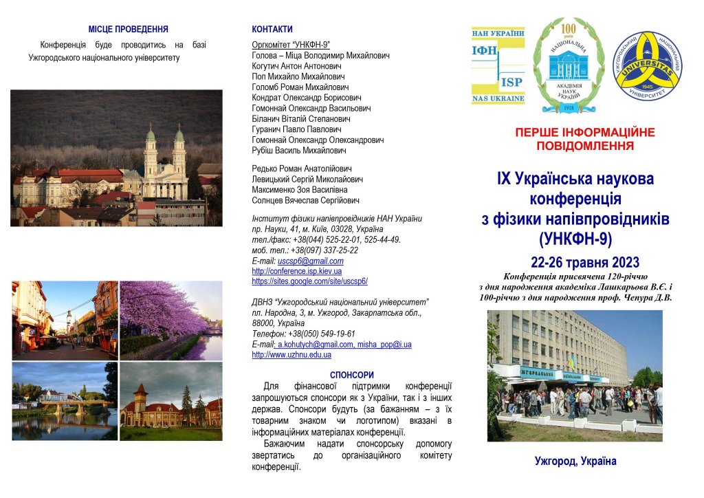 22–26 травня 2023 року на базі Ужгородського національного університету відбудеться IХ Українська наукова конференція з фізики напівпровідників (УНКФН-9), присвячена 120-річчю з дня народження академіка Вадима Євгеновича Лашкарьова і 100-річчю з дня народження професор Дмитра Венедиктовича Чепура.