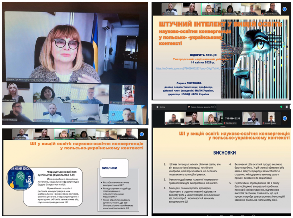 Лариса ЛУК’ЯНОВА, доктор педагогічних наук, професор, дійсний член (академік) НАПН України, директор Інституту педагогічної освіти і освіти дорослих імені Івана Зязюна НАПН України провела на кафедрі загальної педагогіки та педагогіки вищої школи факультету суспільних наук ДВНЗ «Ужгородський національний університет» гостьову лекцію в рамках дисципліни «Психологія та педагогіка вищої школи з методикою викладання» (викладач – проф. О. Товканець) для здобувачів третього (освітньо-наукового) рівня вищої освіти спеціальності А1 Освітні науки на тему «Штучний інтелект у вищій освіті: науково-освітня конвергенція у польсько-українському контексті».
