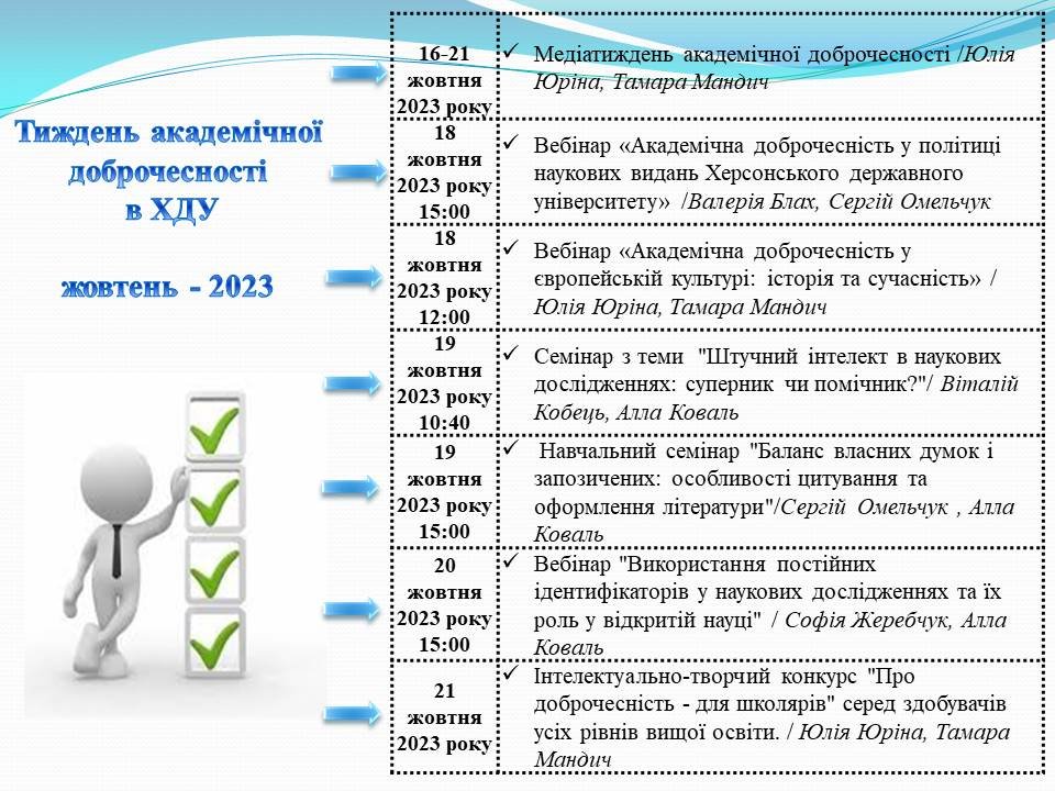 вебінар «Академічна доброчесність у політиці наукових видань Херсонського державного університету» (18 жовтня 12023 року);