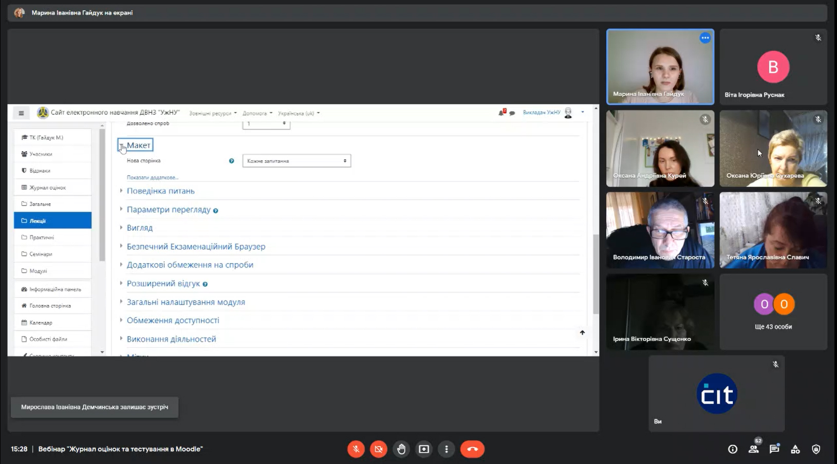 У рамках циклу освітніх онлайн заходів від центру інформаційних технологій 17 лютого відбувся вебінар "Журнал оцінок та тестування в Moodle", у якому взяло участь більше 50 учасників. Спікером виступала Марина Гайдук, начальник відділу електронного навчання ЦІТ УжНУ.